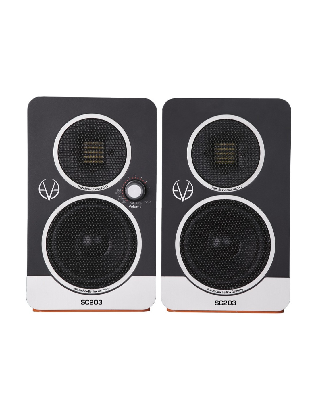 Sistema di monitor da scivania professionali, a due vie, attivi (tutti i circuiti sono contenuti in uno dei due speaker), dotati di woofer schermato da 3" in fibra di vetro, tweeter a nastro con trasduttore micro Air Motion da 1", pannello risonante posteriore, filtri basati su DSP per la regolazione della risposta in frequenza, push knob per il controllo del volume e della risposta acustica, convertitori A/D Burr-Brown di altissima qualità, ingresso analogico RCA, ingresso digitale TOS-Link, presa USB per il coolegamento diretto a computer Mac e PC, conversione a 24 bit/192 KHz, risposta in frequenza 64Hz-21kHz, amplificatori distinti per bassi e acuti con potenza di 2x50W (picco), SPL 96 dB, pulsante on/off, inserti filettati nel pannello posteriore per il fissaggio a parete, su asta microfonica o stativo per speaker. Dimensioni 145 x 230 x 195 mm, peso 3.8 kg. Includono appositi pannelli sotto speaker in gomma isolante per il posizionamento verticale o con inclinazione 7,5° o 15°. N.B. il prezzo indicato è per coppia monitor. Garanzia di 5 anni mediante registrazione sul sito Eve Audio. Verificare nel sito del costruttore i requisiti minimi di sistema e i sistemi operativi attualmente supportati.