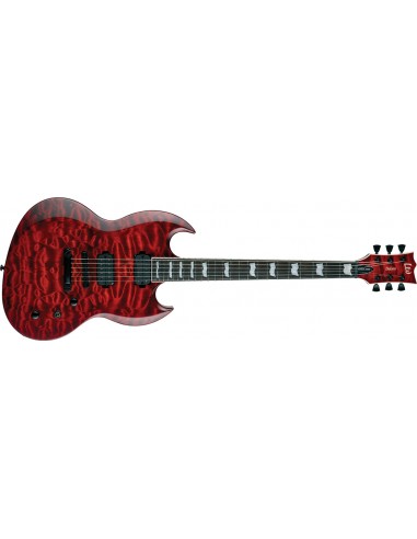 Construcción Set-Thru - Escala de 24,75'' - Cuerpo de caoba con tapa de arce acolchado - Mástil de caoba de 3 piezas con perfil en “U fina” - Diapasón de ébano de Macassar con 24 trastes extra jumbo - Radio de 14” - Cejilla de 42 mm - Herrajes negros - Puente de bloqueo Tonepros - Clavijas de bloqueo LTD - Pastillas Seymour Duncan Sentient/Pegasus - Cuerdas D'Addario XL110 (.010/.013/.017/.026/.036/.046)