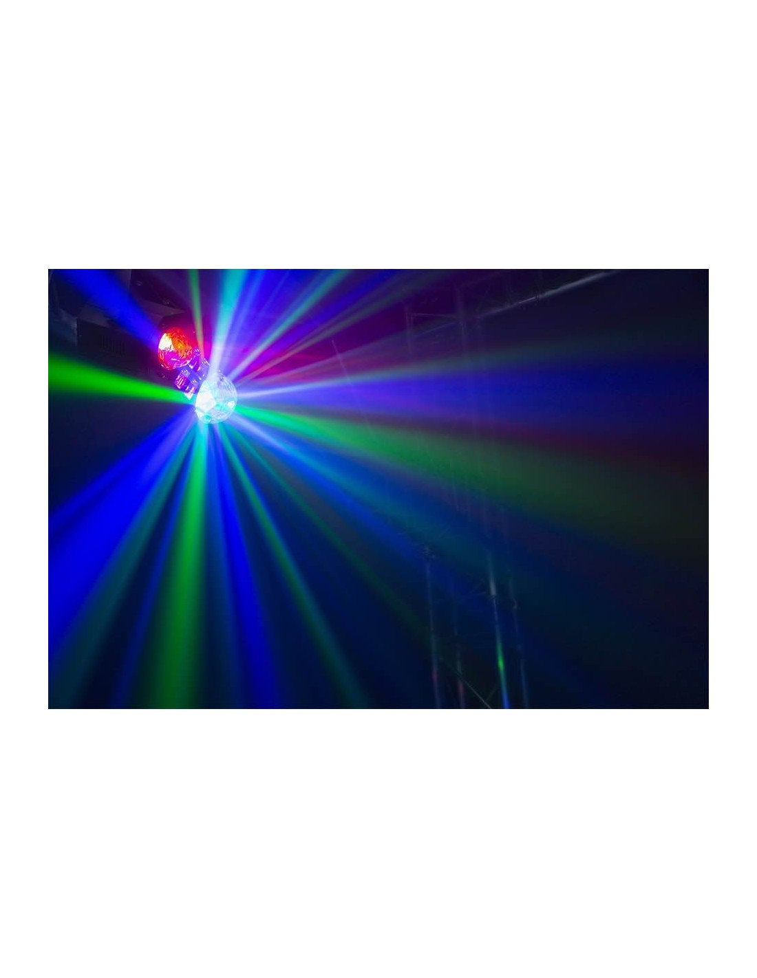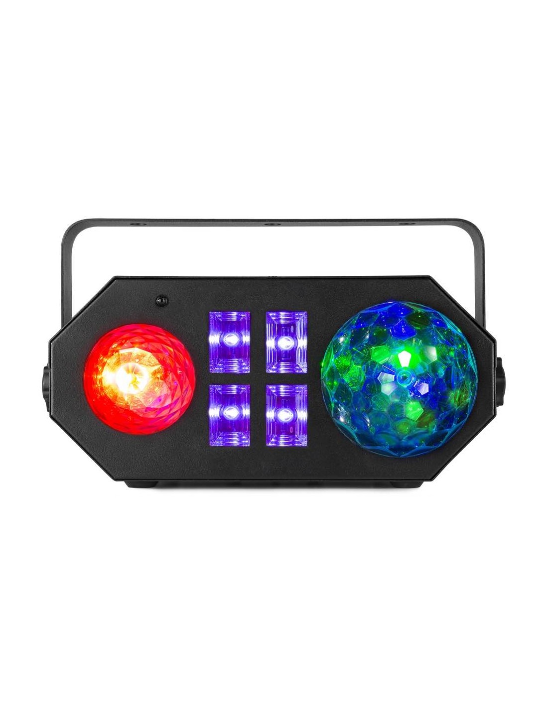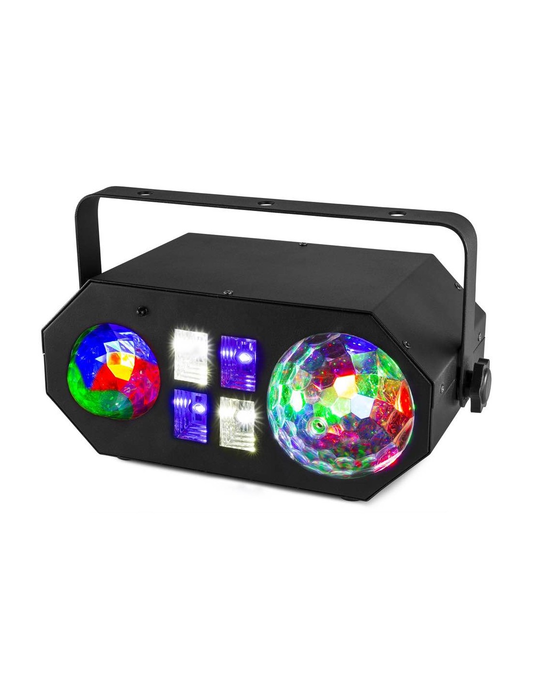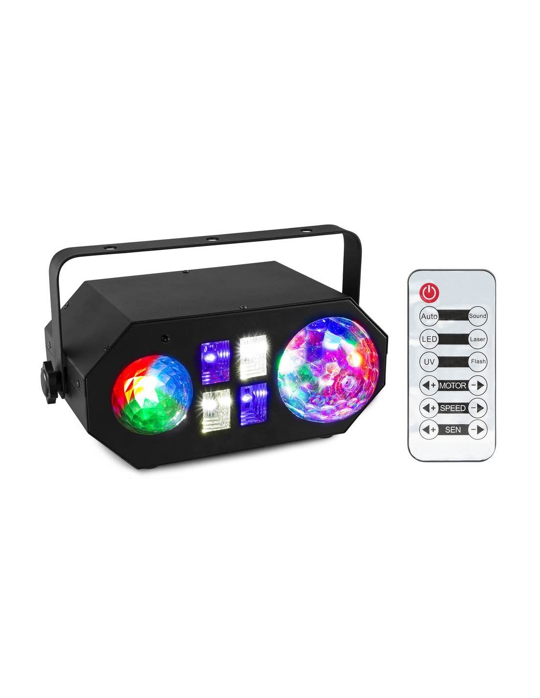 Light source: 5-in-1 LED LED colours: Red, Green, Blue, White, Ultra Violet Quantity of strobe: LEDs 4 Beam angle: 6 Modes: Automatic programs Power consumption: 0.5 - 0.2A Power supply: 100-240VAC 50/60Hz Accessories: Mounting bracket, Remote control Dimensions (L x W x H): 240 x 130 x 112 Weight: 1,60