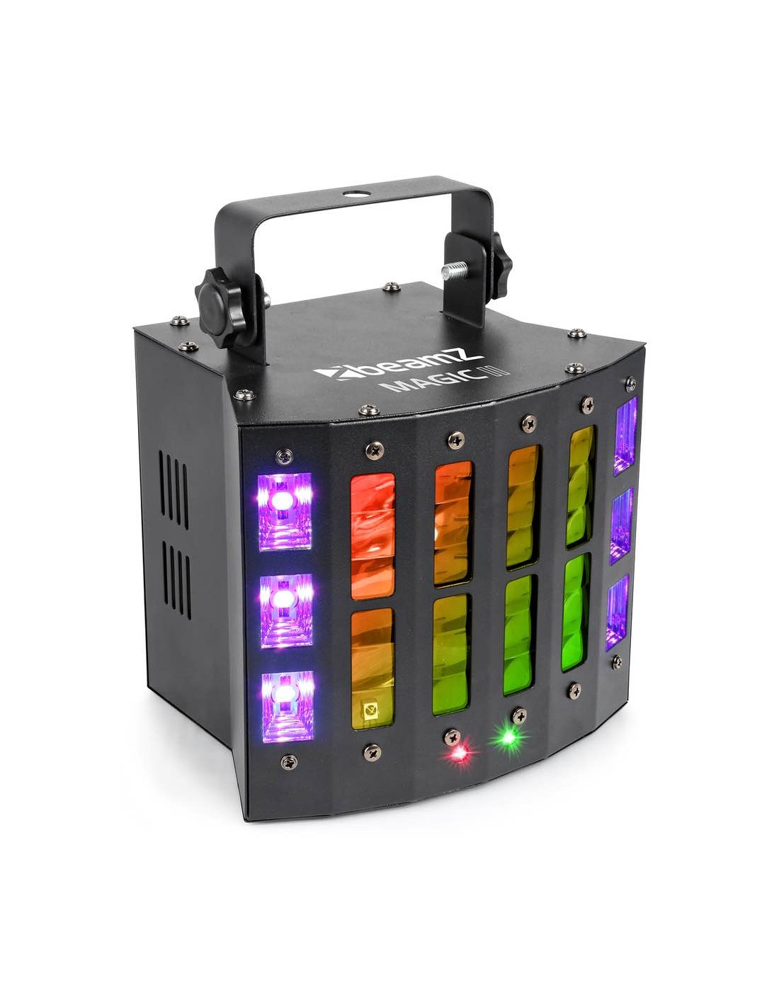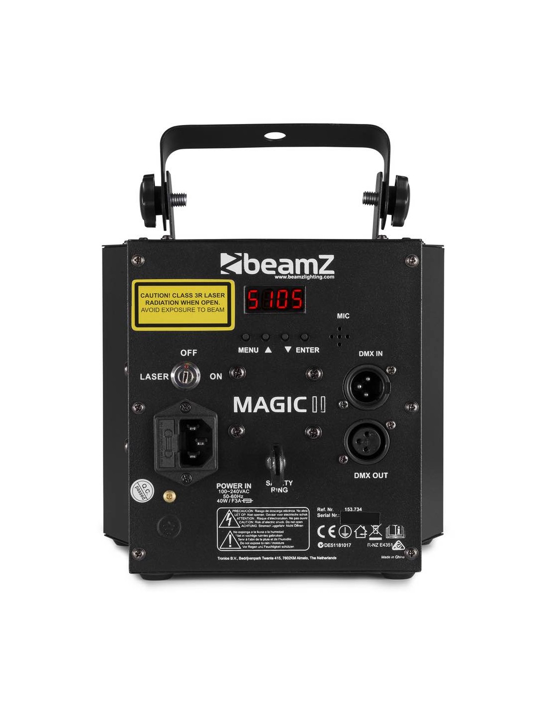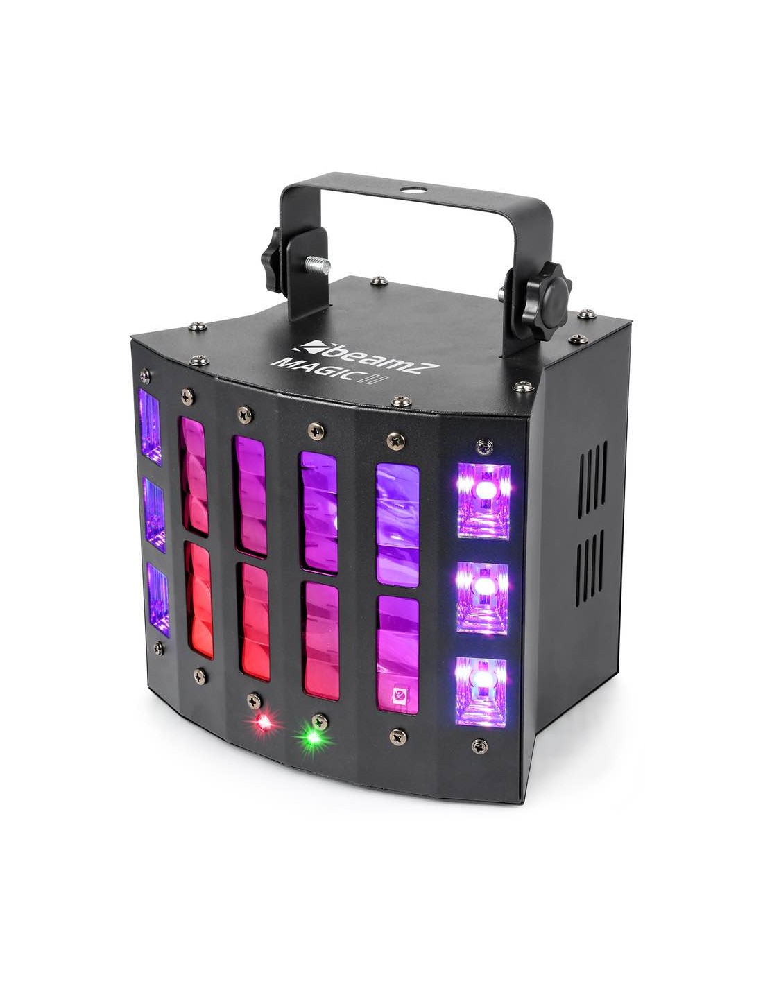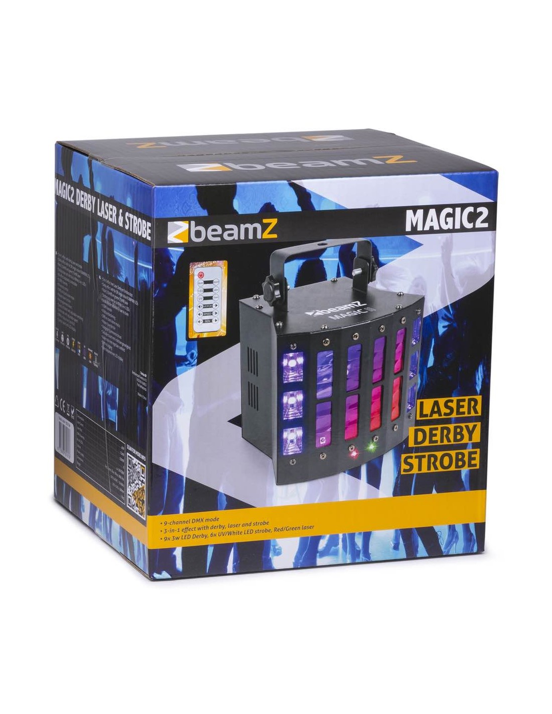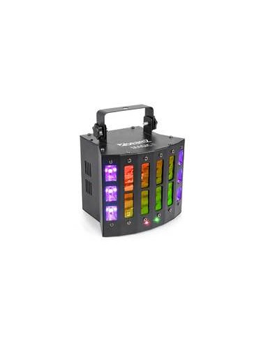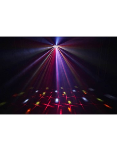 3-in-1 35/5000 effetto con derby, laser e strobo Derby effect con 9x 3W colore singolo RGB WPWW LED laser Rosso (150mW) e verde (75mW) Unità strobo: 6x Uv/Bianco 2-in-1 LED Effetti controllati separatamente 9 DMX canali Telecomando IR Modalità DMX e stand-alone Funzione: Master/slave Show pre-programmabili Suono attivato con sensibilità regolabile Modalità automatica con regolazione di velocità DMX in/output via 3-pin XLR Pannello di controllo con display LED