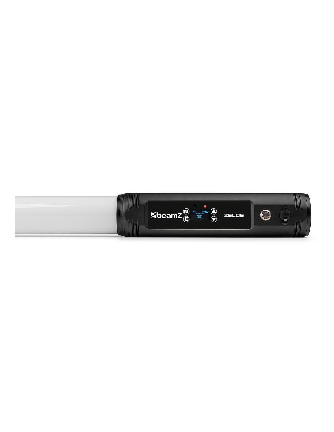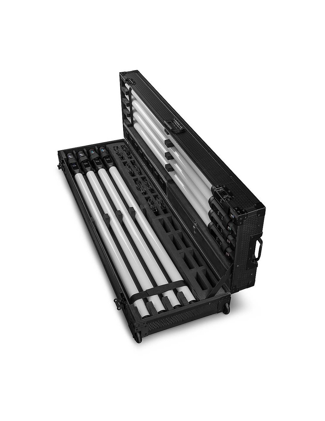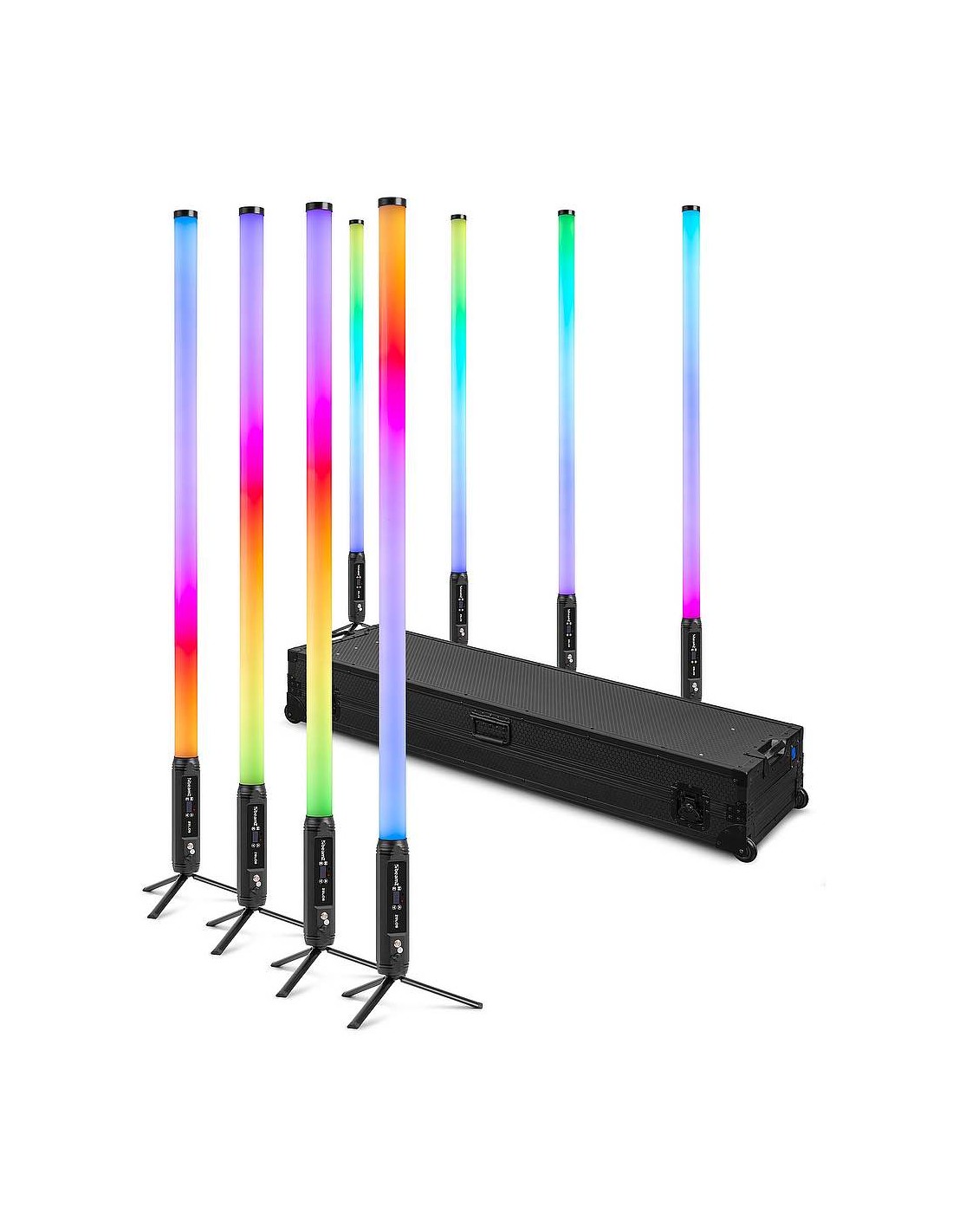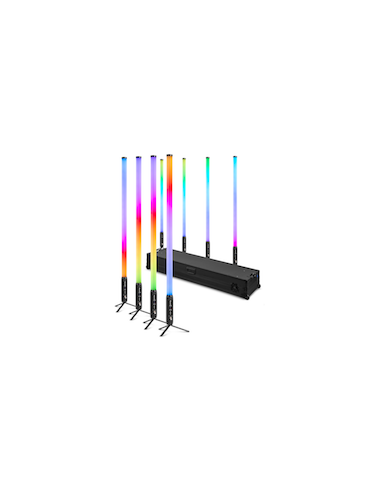 Tubo LED con 192 LED RGB-CW/WW 5 in 1 Miscelazione dei colori RGBW-CW+WW Emissione luminosa a 360° con emissione luminosa uniforme 16 sezioni controllabili 4 modalità di regolazione Modalità automatica (68 programmi) Custodia solida IP65 resistente alle intemperie Funzionamento a batteria (durata della batteria fino a 12 ore) Tempo di ricarica della batteria: 7 ore WDMX integrato (anche per EazyLink) Applicazione IOS e Android per il controllo tramite Wi-Fi Telecomando IR