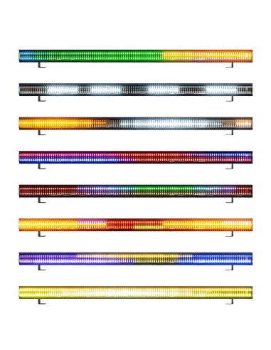 Product colour Black Light source Single colour LED, 3-in-1 LED Colours Red, Green, Blue, Amber, White LED power (single LED) 0.5W Quantity of LEDs 224x RGB LED power: Strobe 2x 112 White/Amber Beam angle 70° Illuminance 5.486 lx @ 1m Flash rate per second 1 - 23Hz Modes Automatic programs, DMX, Master/Slave Sound to light mode Yes RDM Yes DMX channels 7, 13, 82, 130, 135 DMX connection 3-pin XLR IP rating IP20 Cooling Convection Display LCD Power plug P-Con Power consumption 2.18 - 0.979A Power supply 100-240VAC 50/60Hz Dimensions (L x W x H) 1000 x 55 x 100mm Weight (kg) 2,15 Included accessories Mounting bracket, Power cable