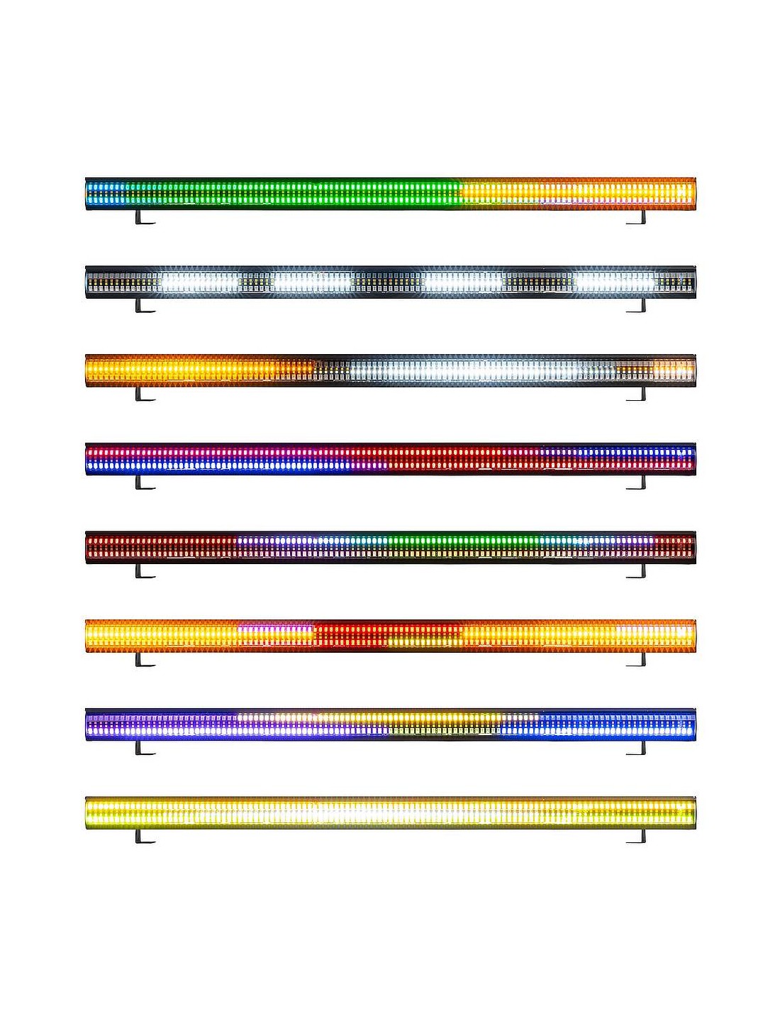 Barra LED stroboscopica RGBAW 224 LED SMD RGB (sezioni superiore e inferiore) 112 LED bianchi SMD e 112 LED ambra (sezioni centrali) 4x 16 sezioni controllabili 36 programmi automatici per le sezioni Bianco e Ambra 68 Programmi automatici per le sezioni RGB Modalità DMX e autonoma Funzione master/slave 3 modalità audio con sensibilità regolabile Ingresso/uscita DMX tramite XLR a 3 pin Ingresso/uscita connettore di alimentazione P-Con Pannello di controllo con display LCD Collegabile con il sistema di aggancio rapido