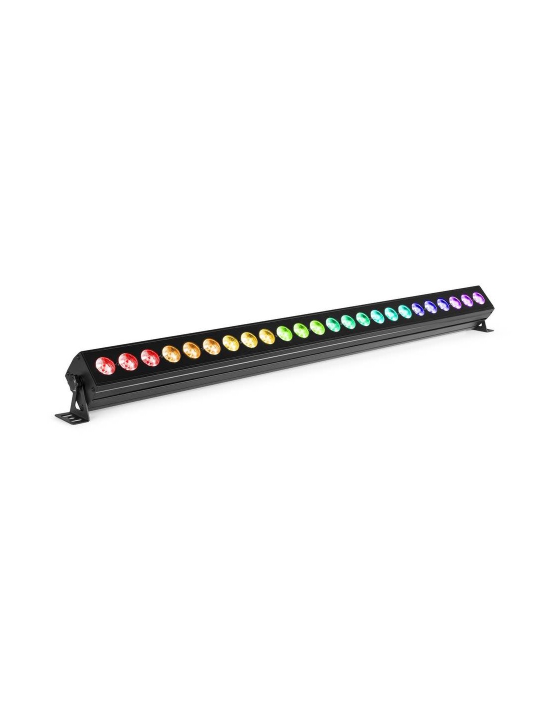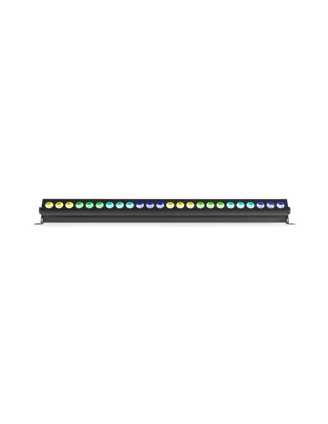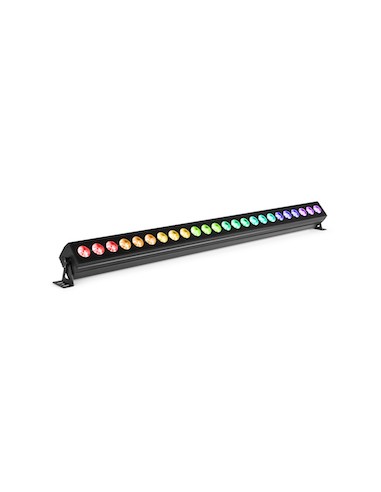 Supplied features Master/Slave mode Light source 6-in-1 LED LED colours Red, Green, Blue, Amber, White, Ultra Violet LED power 6W Quantity of LEDs 24 Beam angle 20 Field angle 33 Illuminance 5.675 lx @ 1m Flash rate per second 1 - 20Hz DMX channels 8, 11, 20, 36, 74 DMX connector 3-pin XLR Modes Automatic programs, DMX, Manual, Master/Slave Daisy chain Yes (max. 8 bars) IP rating IP20 Cooling Temperature controlled fan Display LED Power plug Power-connector Power consumption 1.70 - 0.90A Power supply 100-240VAC 50/60Hz Dimensions (L x W x H) 1010 x 75 x 76mm Weight 3,65 Accessories Mounting bracket, Power cable