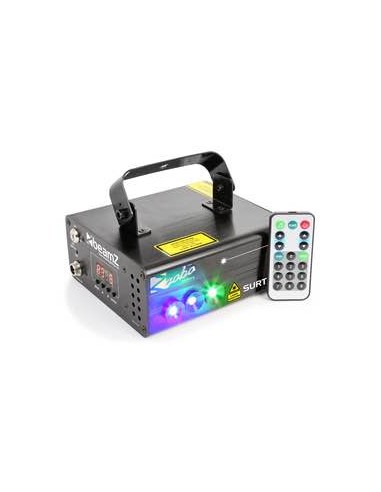 Laser Rosso (225mW) e Verde (80mW) LED Blu (3W) Modalità DMX e stand alone 7 canali DMX Controllo remoto IR Laser con 8 gobo Show pre programmati Attivazione sonora Modalità automatica con velocità regolabile