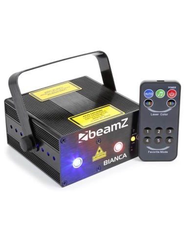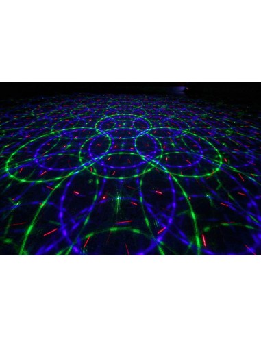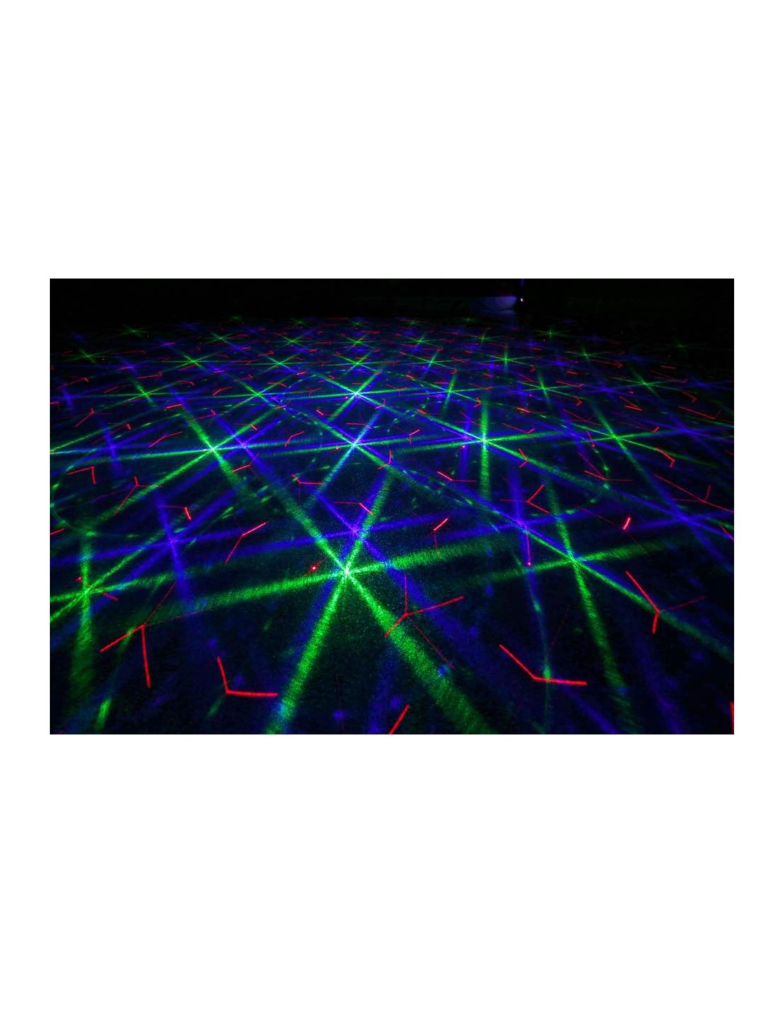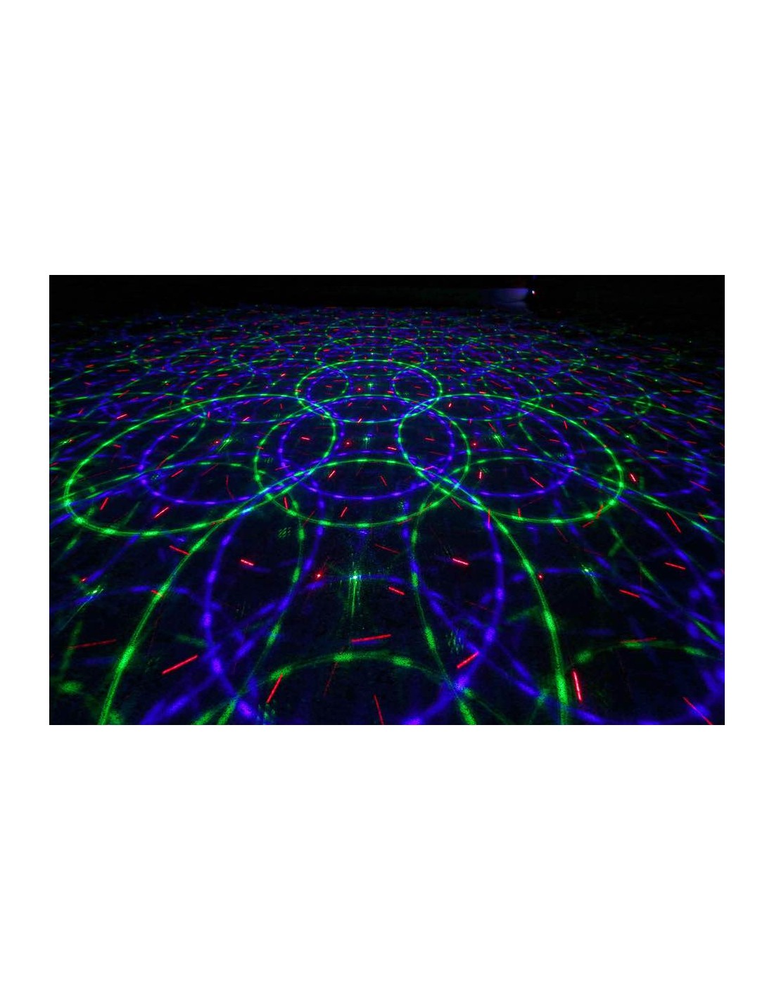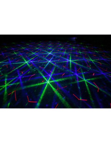 Laser Rosso (150mW), Verde (30mW) e Blu (150mW) Controllo remoto IR Laser con 12 gobo Show pre programmati Attivazione sonora Modalità automatica con velocità regolabile