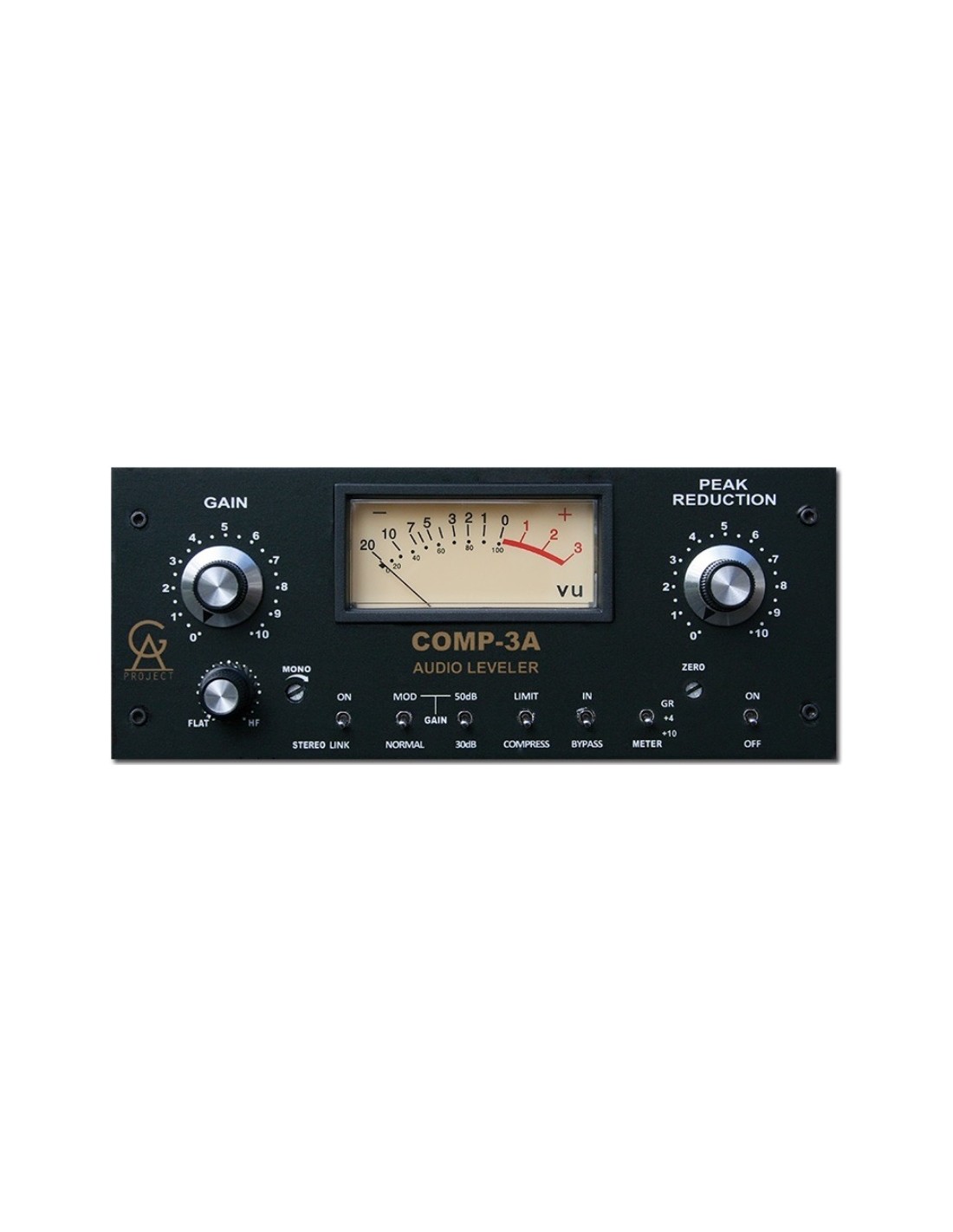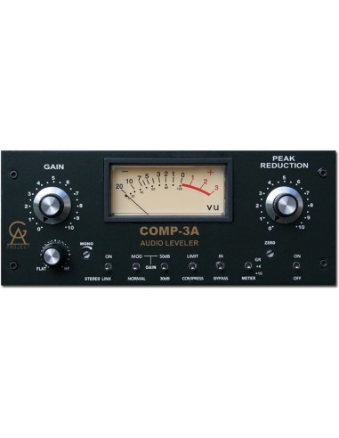 Compressore vintage a un canale, basato sui classici circuiti utilizzati nel famoso LA-3A. Realizzato con componenti discreti e trasformatore bilanciato in input/output con possibilità di selezione della resistenza in uscita, controllo HF per esaltare le medio/alte frequenze, utilizza il classico attenuatore elettro-ottico T4 per il controllo del gain. È quipaggiato con due manopole per gain e peak reduction, interruttori On/Off, true bypass, compressor/Limiter, link (per l’utilizzo di 2 Comp-3A in stereo), meter comp/output e indicatore di livello analogico.